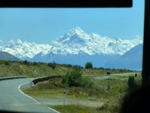 テカポ湖を出て30分もたったでしょうか、トムさんが突然「マウント・クックが見える!」と興奮した声で叫び車内が騒然とし始めました。ガイドさんによると「こんなに遠くからマウント・クックの山頂が見られるなんて、本当に珍しいことです。皆さんラッキーですね」とのこと。「ヤッター!」。