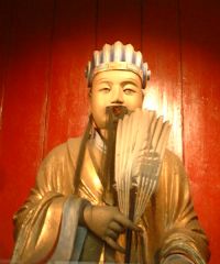 この史跡は、最初は「劉備のお墓に付随した"昭烈祠"」だったのが、いつの間にか「孔明を祀る"武侯祠"」になってしまった、と言われています。その人気が主君を上回ってしまい、お堂の中の孔明さんはハラハラしているかもしれませんね。 |  名宰相"諸葛孔明"のお堂は主君劉備に遠慮して、 "昭烈祠"の背後、一段低い所に建てられています