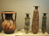 | | 左がアレクサンダー大王の父、フィリッポス2世の骨が入っていたという黄金の小箱。蓋にはマケドニア王家の象徴、太陽の紋章(光線が16本)が刻印されています。王妃と見られる女性の骨が入っていた小箱も展示されていましたが(向かって右)こちらの太陽は光線が12。天皇家の菊のご紋章が16弁というところを見ると「16」という数字には何か意味がありそうですが、どなたかご存知? |  ガラスの副葬品