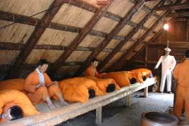 | | 『囚人を使えば工賃は半分以下、酷使して死んだとしても一般人に比べれば責任は軽く、監獄支出の減少にもなり好都合」だから「北海道開拓のため、大いに囚人を使うべし』 (山谷一郎著「網走刑務所」より) と言う明治政府の方針の元、北海道開拓の急務、オホーツク沿岸と道央(札幌)を結ぶ中央道路の開削に囚人を使おうと、明治23年に釧路監獄の分監として開設されたのが網走監獄。 |  休泊所(再現構築) : 別名「動く監獄」 この様式が後の工事現場等に取り入れられ、タコ部屋と呼ばれるようになった
