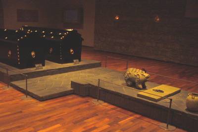 | | 第一室は照明が抑えられ、まずは王陵を守る石の聖獣が見学者を迎えます。この聖獣、スポットライトの当て方かちょっと不気味にも思えましたが、どう見ても大きな「ブタの貯金箱」。この子が良くぞ今まで盗掘から、王と王妃を守ってくれたと褒めてあげたくなりました。 |  石獣に守られた、武寧王墓の模型展示 左の棺は、日本でしか自生しない高野槙製
