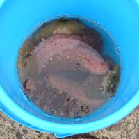 | | 遊歩道の途中に少し広くなった場所があって、数人の人たちが焚き火を囲んで酒を飲み、刺身などを食べていました。周囲には帽子とスカーフでしっかり強風対策したオモニ達が忙しく立ち働いています。どうやらここは野外レストラン。もう日没とあって、最後の客の相手をしながら片付け作業をしているようです。 |  バケツの中は大きな海鼠(ナマコ)