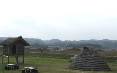 | 「あちらに青いビニールシートが見えますね。あれが、1.1m以上の柱の跡が見つかった祭儀場跡で、左手の山すそに見えるのがこれから向かう展示館です」と教えてくれました。指先を追って右から左へと視線を動かしていると、「この周辺一体が王都があった場所なんですが、結構広々としているでしょう。ここは長崎県では2番目に広い平野なんですよ」と言葉が続きます。