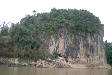 | | 正面下部に白く見えているのが下の洞窟。向かって左上に小道を辿ると木立に隠れた上の洞窟に着きます。入場料は両方込みで8,000キップ。上の洞窟は明かりがなく暗いので懐中電灯は必携ですが、無ければ1,000キップで借りることも出来ます。 | |