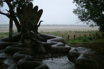 | | ラオスに入って3日目、雨が降り出しました。雨足も激しくなってきたので「これでは写真にならない」と、ラオスのシンボル"タット・ルアン"行きを、面白い造型が見られるという場所に変更。一昨日渡ったラオス・タイ友好橋近くを通過し、ワット・シェンクアン(別名ブッダ・パーク)へ。 |  摩訶不思議なルアン・プー・ワールド