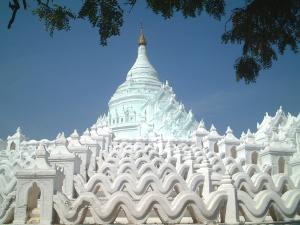 | | 船着場からは、ミングォン・パゴダ、ビルマ最大のミングォンの鐘、そしてシンピューメェと、見所が一直線に並んでいます。一番遠いシンピューメェまで牛車で行くことも出来ますが、数百メートルですから土産店でも覗きながらポコポコ歩いていきましょう。 |  背後仏?でしょうか