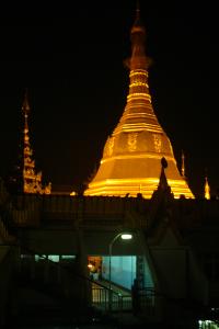 | | 空港からタクシーで町に出て宿を探し、兌換紙幣を流通紙幣に両替するためにホテル街をウロウロし、一息つく頃には街には夕闇が迫っていました。 |  ライトアップされたスーレー・パゴダ