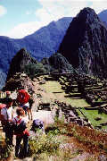 | マチュピチュは高山にあると思ってしまいますが、実際はクスコよりかなり標高が低く「クスコで高山病にかかったらマチュピチュに」と言われるほどです。列車を降りると駅前にはバスが何台も待っていて、観光客が満杯に乗せては走り出します。九十九折の坂道を登りきったところが、「空中都市マチュピチュ」です。見所は沢山あったのですが、カメラがないので気楽なもの。一通りの見学を終えたら、石垣の上に寝転んで日本より数倍も高い空を見ていました。