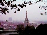 | | この教会と道路を隔てて向きあっているのがお城のある丘。目標が大きいので間違えることはないだろうと思っていたのですが、麓まできましたら道は丘の上へは向かっていません。困り果て近くのお店で尋ねると、「自動車道路は迂回しているので住宅の中の山道を登りなさい」と教えられました。 |  お城からの眺め:手前が前記の教会、左遠くに見えているのがキエフ・ホテル